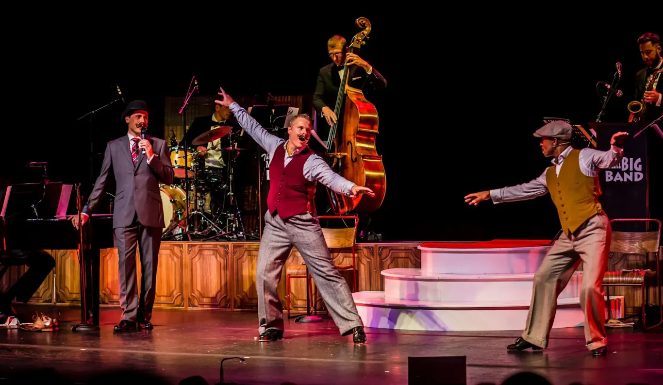 While the comedy is relentless, it never comes at the expense of the music. The Mini Big Band are sensational, creating a huge, rich swing sound that feels far bigger than the number of musicians on stage. They transport the room straight back to the golden age of crooning, providing the perfect foundation for the three leads. Marek, Whitley and Barley each bring their own vocal character, and when they come together the harmonies are effortlessly smooth. These moments sit really effectively amongst the comedic chaos to remind you just how accomplished these performers are. This is enhanced further by the choreography, drawing on swing, Charleston and tap, with Whitley and Marek's tap sections in particular standing out as impressive moments. These are world-class entertainers that can seemingly do it all.