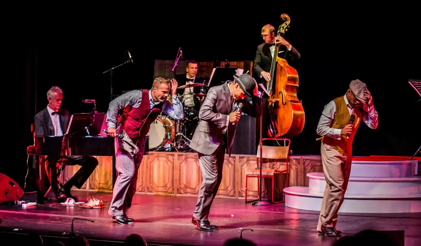 Last night saw the UK tour of Crooners roll into Peterborough, delivering a night of musical excellence, chaos and constant laughter. The show was created by Roman Marek, who writes, directs, produces and stars in the show as Charlie. The passion and joy Marek has throughout this show is palpable, bringing a lovable slapstick nature to the centre of the madness. However, this is far from a one-man operation. He is joined centre stage by two fellow crooners, Winston, played by Jim Whitley, and Rupert, played by Phil Barley, each of whom bring their own quick wit and character stylings that make this a show to remember. The three crooners are then joined by the sensational Mini Big Band, who breathe dazzling life into every song played.