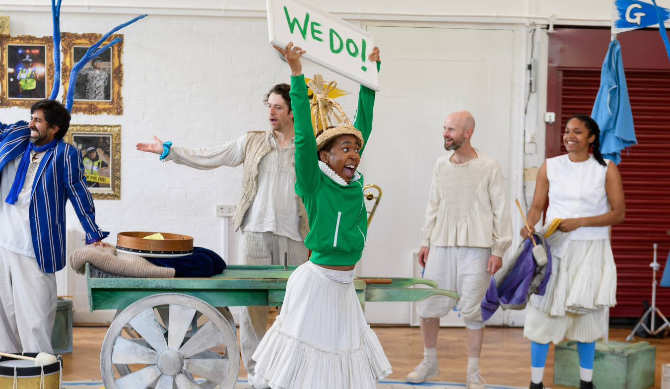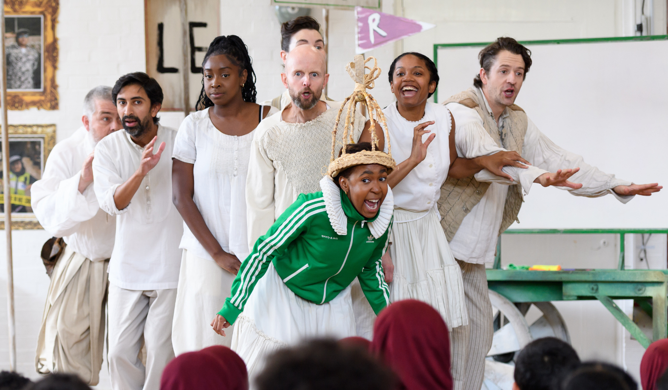 Justine Themen's adaptation transforms the epic tragedy into a 90-minute story by trimming dialogue and combining or omitting certain characters to make it more digestible for new eyes. Despite this, the production remains faithful to the story while succeeding in winning over new fans. Considering the tone and themes of this work, the brevity helps ensure audiences remain engaged throughout the runtime. With the script remaining true to the original, much of the light-heartedness comes from the talented cast of players who all multi-role to bring the tale to life. Whether it is everyone hesitating to don the tabard that transforms them into Oswald or their expressive asides, they succeed in the difficult challenge of keeping an audience of schoolchildren entertained. The most inventive section of the play is also the most humorous, as Deven Modha’s Edgar workshops his Poor Tom persona with references to frappuccinos and playful audience interaction.